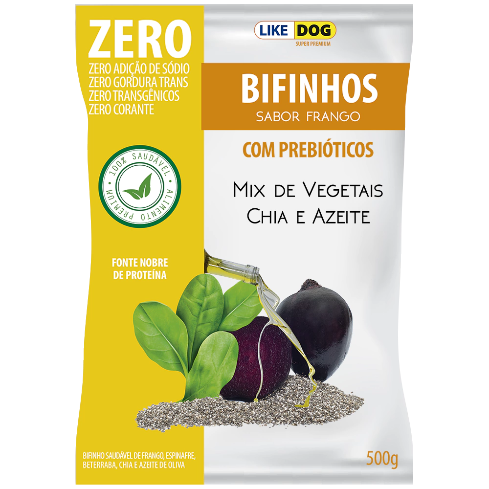 Seu cão merece o melhor! Nosso Bifinho Super Premium Sabor Frango com Mix de Vegetais foi desenvolvido para proporcionar um momento especial de carinho e nutrição no dia a dia do seu pet. Feito com carne de alta qualidade, mix de vegetais naturais (espinafre, beterraba e chia) e azeite de oliva, é uma explosão de sabor e saúde em cada mordida!
